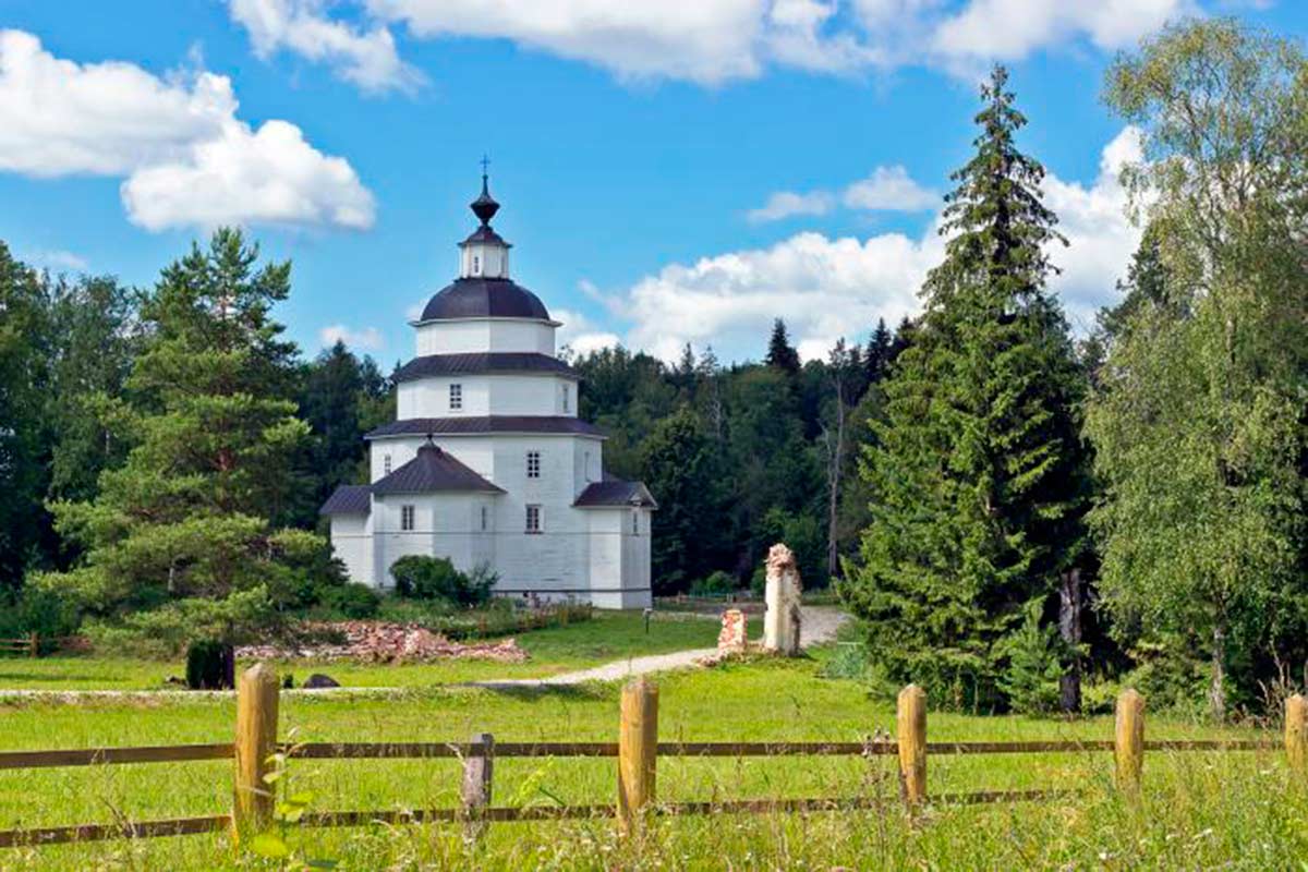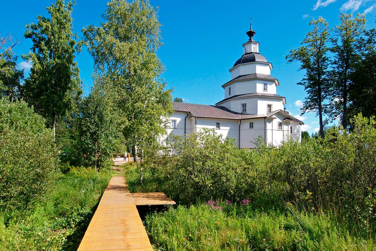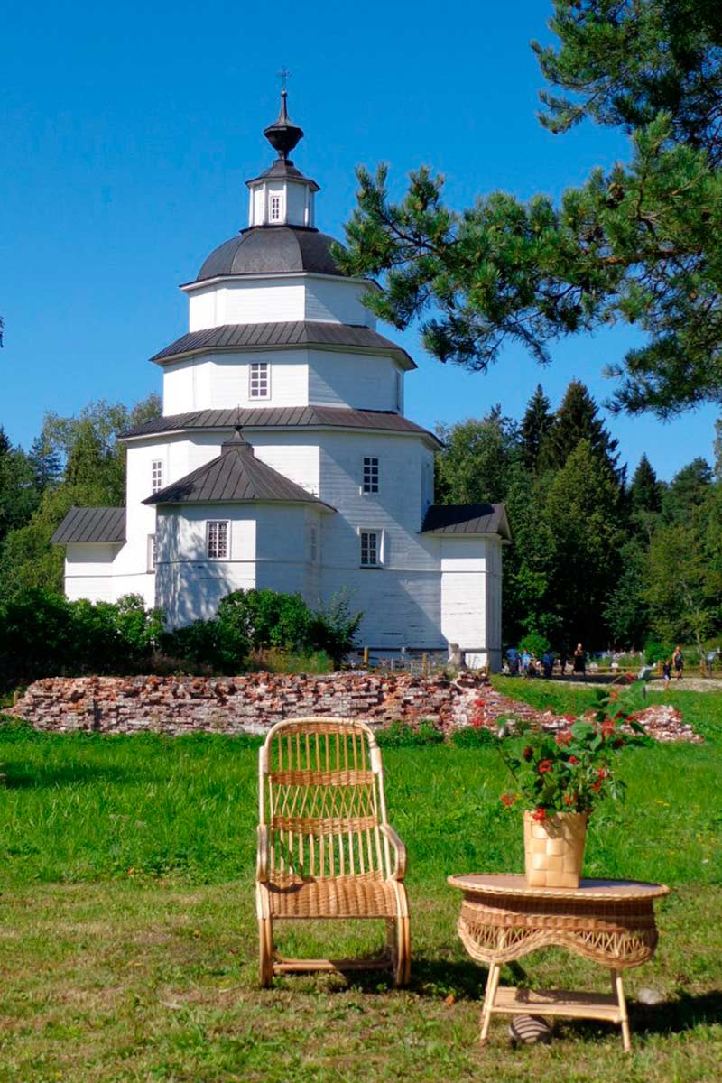 Сама церковь – редкий сохранившийся образец деревянной архитектуры 1755 года постройки. Храм возводили без единого гвоздя, зодчие работали специальными топорами, оставляющими на дереве прямой срез. Здесь же можно увидеть и выставку, посвященную уникальной реставрации, проведенной почти двадцать лет назад. Реконструкция проводилась по методу полной переборки с применением исторических строительных инструментов и технологий – ведь больше половины строительного материала сохранилось с 1755 года. Огромную помощь в реконструкции оказали прихожане, например, большинство бревен им пришлось поднимать в гору вручную.