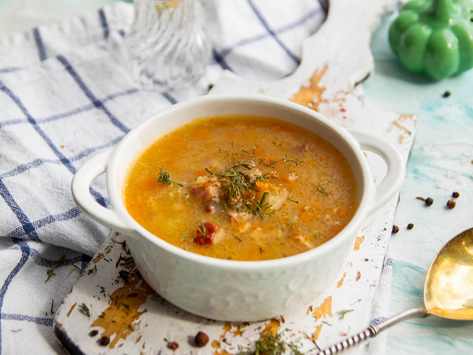 Готовится в трапезной «Изборск-парк из копченой рульки, маринованных огурцов, картофеля, томатов, чеснока, редьки и кабачков. Подается со сметаной и зеленью.