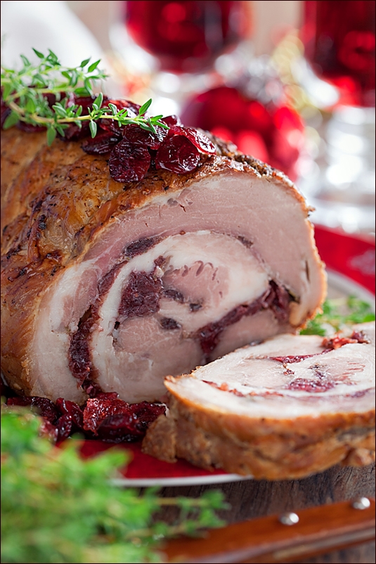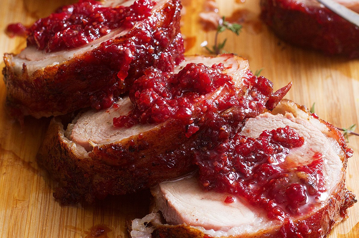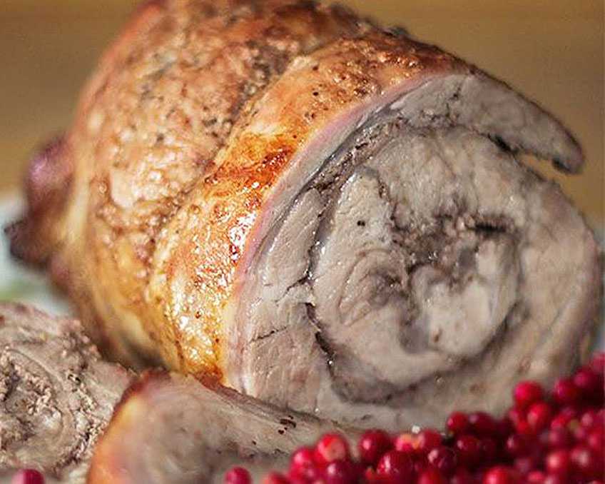 Мясной рулет из медвежатины или лосятины под брусничным соусом.