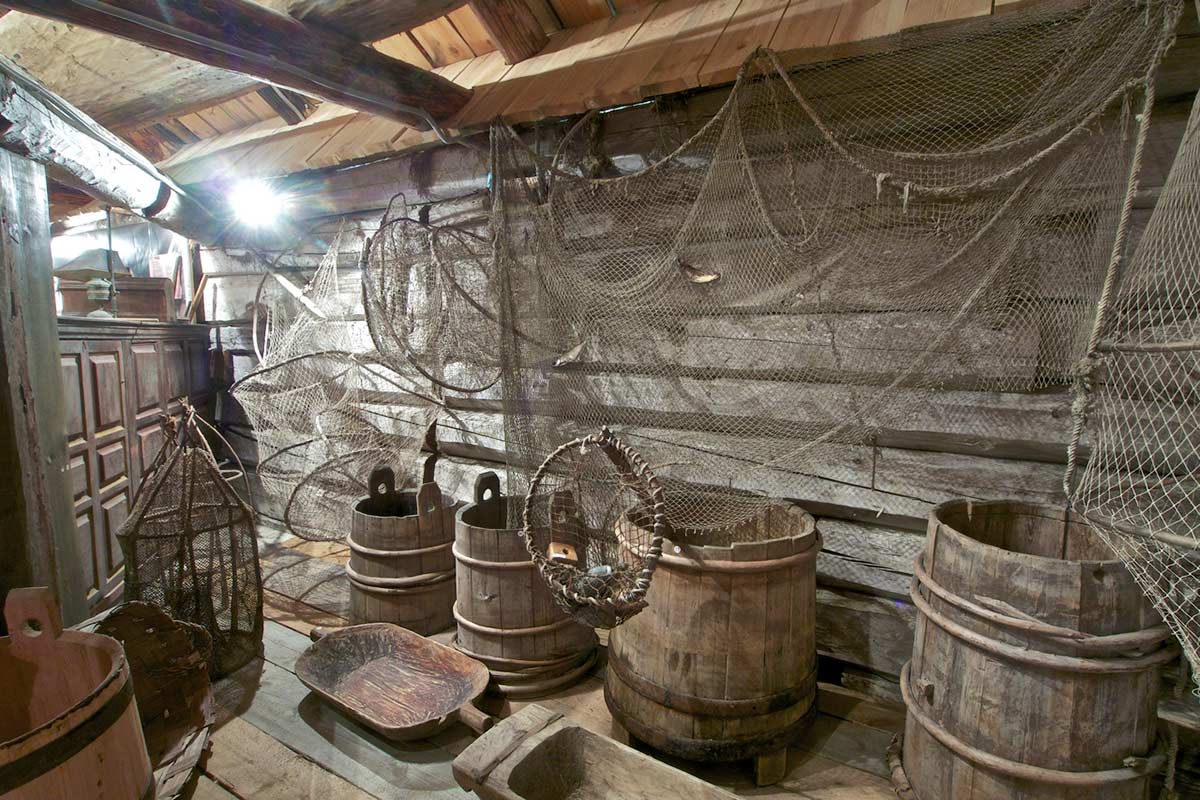 Это сегодня «рухлядью» называется всякий старый скарб. А наши предки этим словом обозначали движимое имущество. Вполне годное к пользованию. «Рушати» или «рухать» от которого произошло само слово рухлядь, означало двигать, шевелить. Поэтому в этнографическом музее «Рухлядный амбар», который находится недалеко от пристани, находятся совсем не осколки воспоминаний, а воссозданные интерьеры деревенских изб, наполненные предметами быта, орудиями труда, ремесленными инструментами, рыболовными снастями. Есть даже абсолютно настоящая рухлядь – северные сани. А коллекция различных изделий из дерева, глины, металла - удивительна. Вам очень повезет, если экскурсию проведет Сабина Подосенова, 15-ти летняя девочка-экскурсовод, победитель конкурса «Лучший гид России» в номинации «Лучший гид до 18 лет». Ее зажигательные рассказы наполнены глубокими знаниями и любовью к своему родному краю.