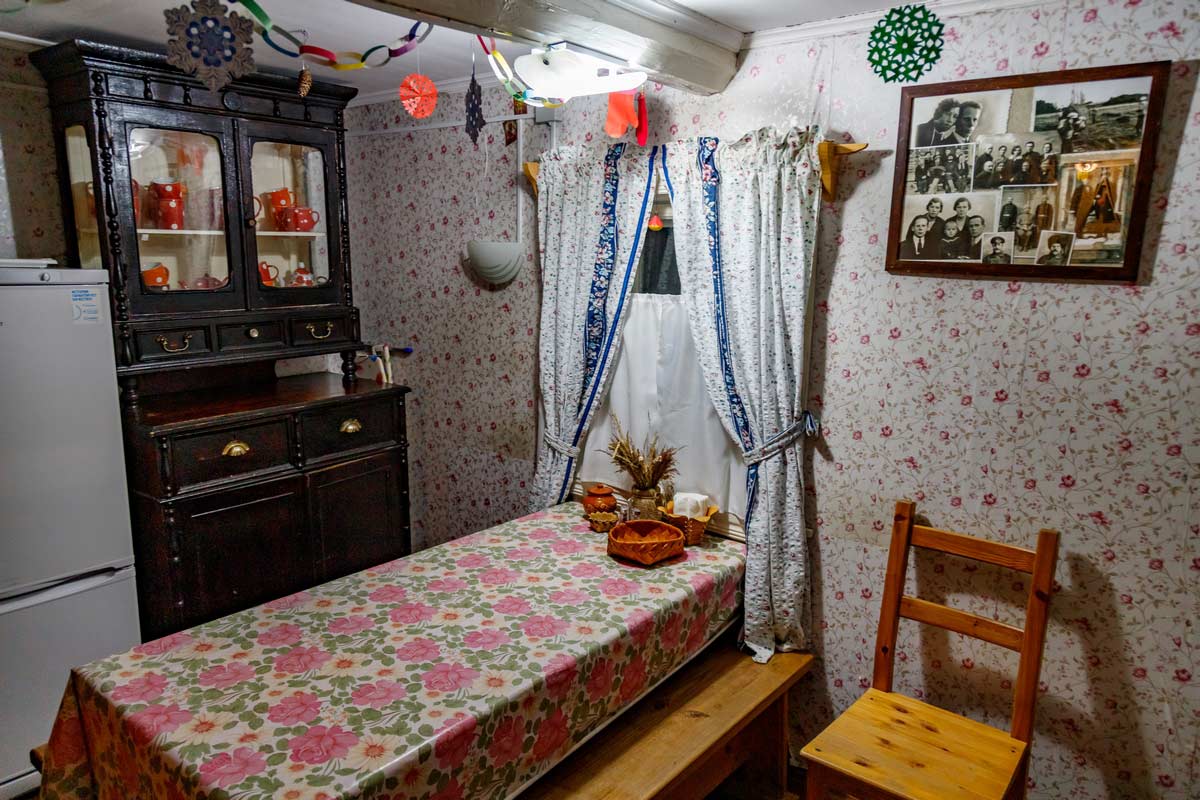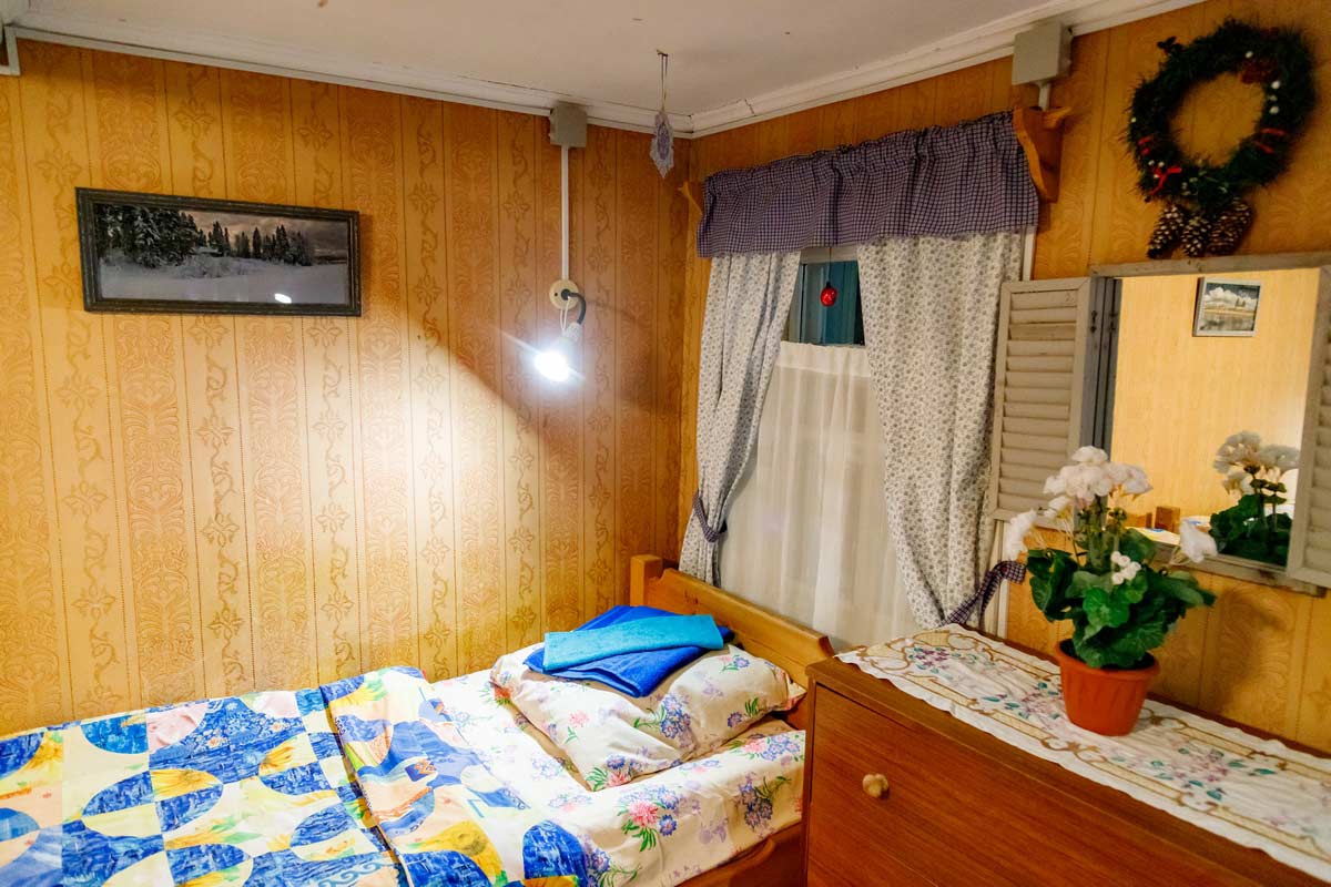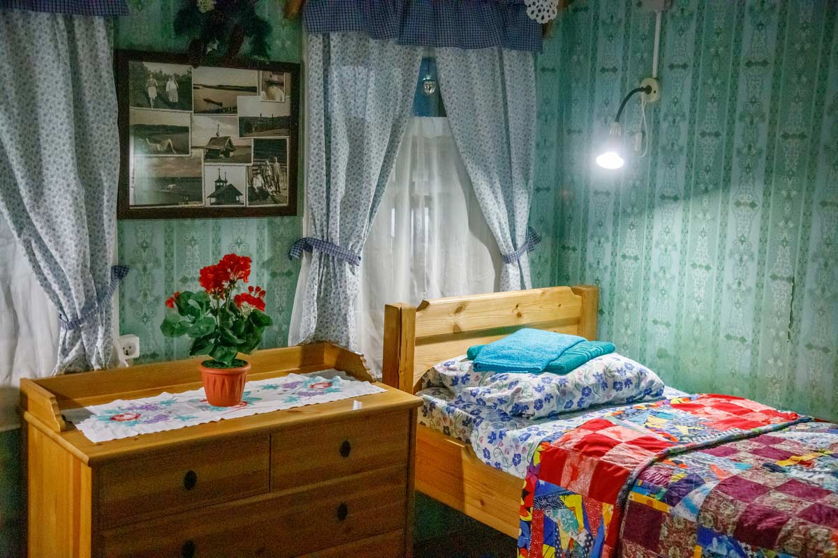 Старинный дом оформлен в традиционном крестьянском стиле - деревянная расписная мебель, лоскутные одеяла, тканые половички. Две комнаты на 4 спальных места каждая. Кухня с холодильником, чайником, электроплитой и посудой. В пристройке современного типа могут разместиться 6 гостей в трех комнатах. Также оборудована кухня со всем необходимым. От дома ведет спуск к озеру. Здесь можно купаться и ловить рыбу. Есть две бани.