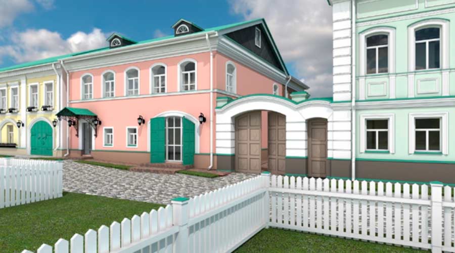 Этот особняк воспроизводит классическое убранство фасада расположенного здесь ранее жилого дома. Небольшой снаружи, внутри дом приятно удивляет большой площадью – 292,7 кв.м. На двух этажах расположены гостиная, кухня-столовая, пять спален, шесть санузлов, несколько гардеробных и технических помещений. Арочные ворота – обязательный элемент строительства жилого дома в Вятском, виртуозно обыграны как эффектный элемент экстерьера: за ними спрятано панорамное остекление гостиной.